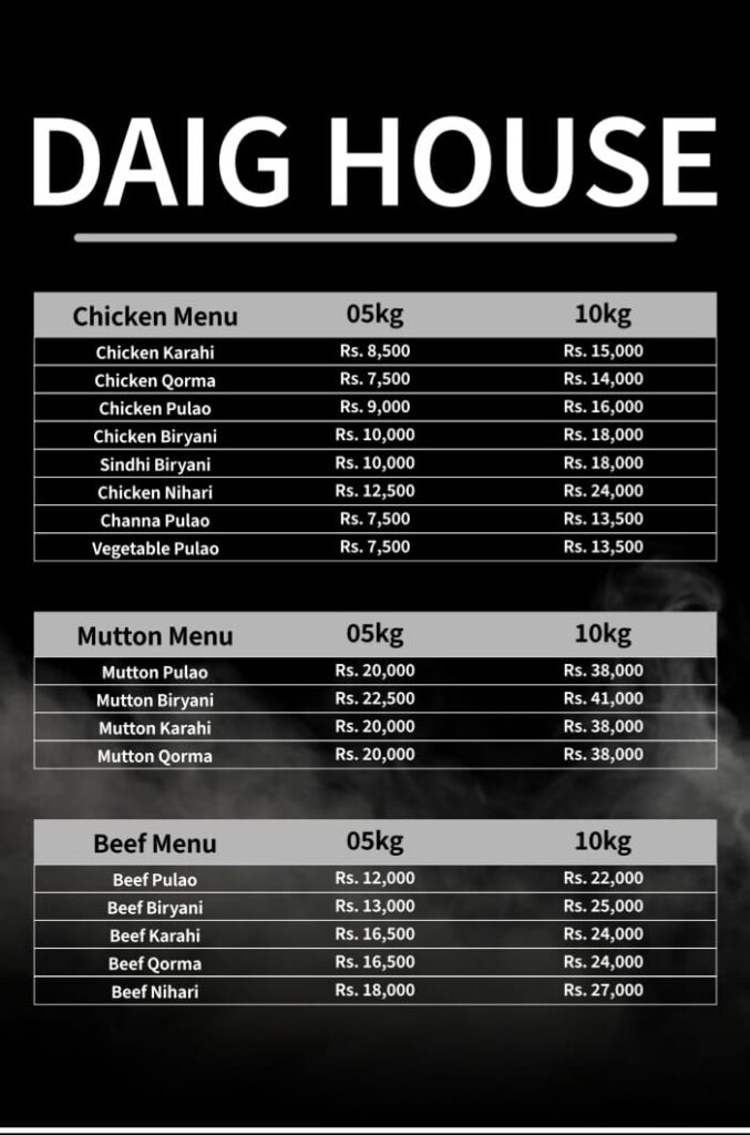 The following additional services have extra charges: Soft Drinks, Mineral Water, Decor, Canopy, Stage, Pedestal Fans, Gas Heaters, Generators, Extra Lighting, Home Lighting, Sound System, and Live Tandoor Charges.